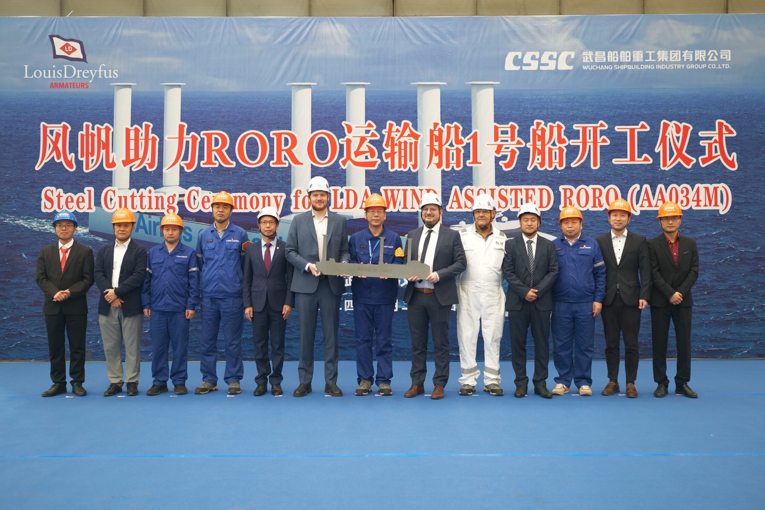 LD Armateurs a participé à la cérémonie de la découpe de la première tôle pour le premier des trois RoRos bas carbone qui seront affrétés à Airbus. L’événement qui a eu lieu le 24 octobre, a été organisé par le groupe CSSC au chantier naval de Wuchang en Chine, en présence de LDA, du chantier et de la société de classification Bureau Veritas Marine & Offshore.
